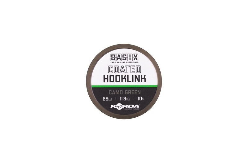 Влакно за повод Korda Basix Coated Hooklink 25lb е меко, гъвкаво влакно с покритие, който може да се използва за много различни презентации на стръв и поп ъп топчета. Както външното покритие, така и сърцевината на влакното имат „камуфлажен“ цвят, който гарантира, че материалът се слива с дъното перфектно. Цветът на влакното е Camo Green /камуфлажно зелено/.
