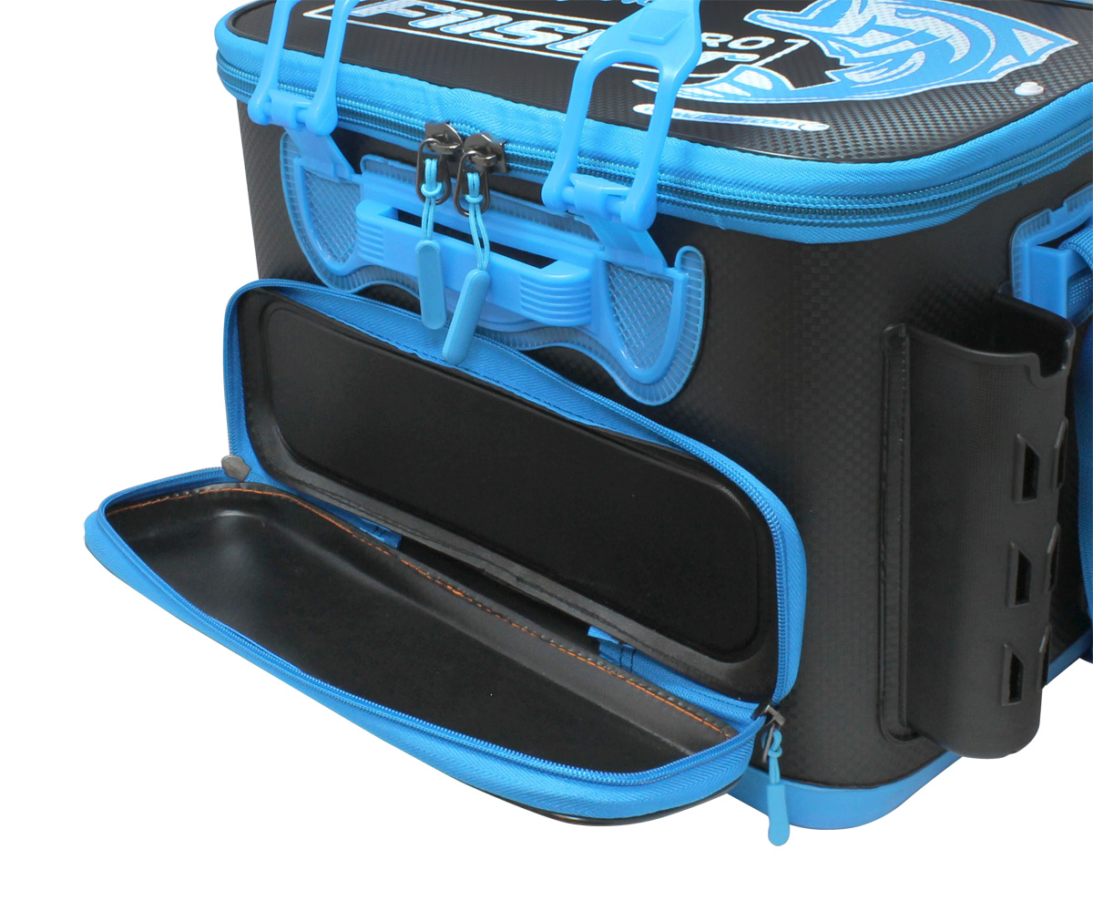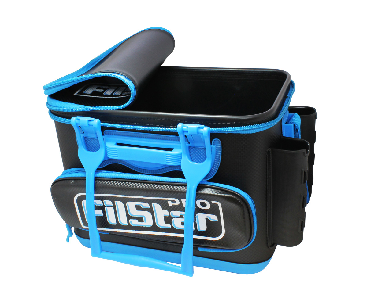 Водоустойчива чанта FilStar EVA – FSYD-36 – Представлява голяма водоустойчива чанта за съхранение и транспорт на риболовни принадлежности, разполагаща с голямо основно отделение, преден джоб с цип и вложки за въдици и инструменти. Моделът е изработен от здрава EVA материя по безшевна кройка и е оборудван със солидно PVC дъно за по-голяма устойчивост. Впечатляващ външен вид с комбинация от черен и син цвят, плюс атрактивни принтове с хищна риба и лого Filstar, разположени от двете надлъжни страни и капака.