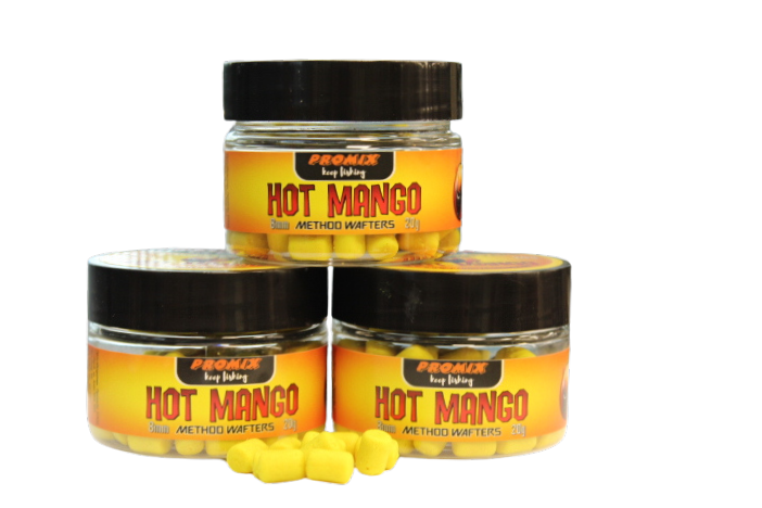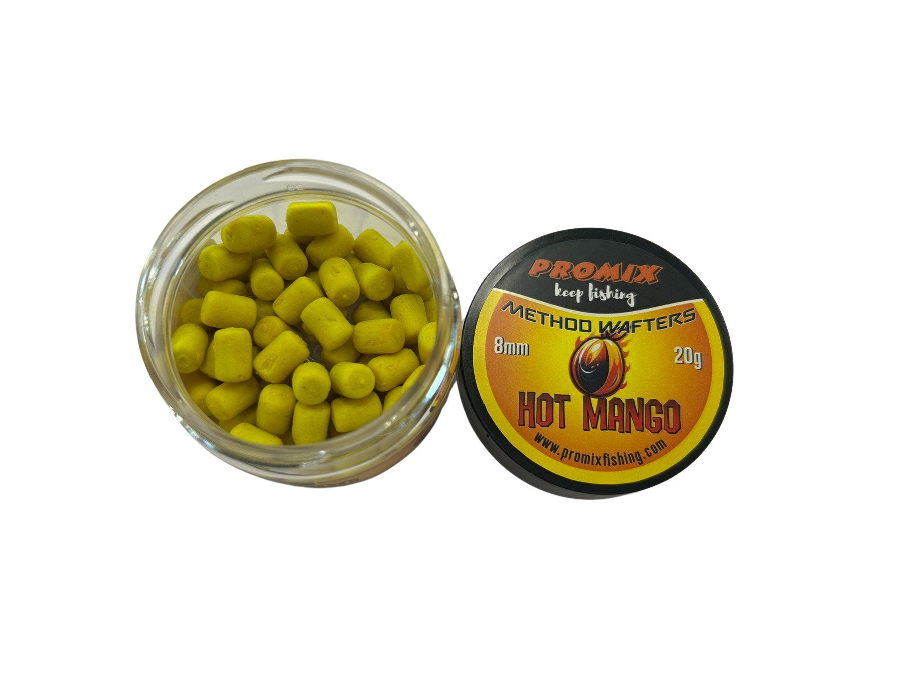 Дъмбели PROMIX Method Wafters Hot Mango 8mm – Дъмбели за метод фидер риболов, създадени след редица тестове в свободна и състезателна среда. Решихме да създадем дъмбели по наш вкус и цвят и да сме сигурни че се представят перфектно по време на риболов. Дъмбелите са критично балансирани със ярък жълт цвят и наситен аромат на люто манго. Люти на вкус. Притежават също така и перфектна плаваемост. Независимо колко време ще престоят във водата, дъмбелите няма да спрат да отделят аромат. Подходящи за монтиране с bayonet /шип/ или bait band /силиконов ринг/. Размер: 8мм, Аромат: Люто Манго, Цвят: Наситено Жълт, Разфасовка 20г, Диаметър: 8мм.