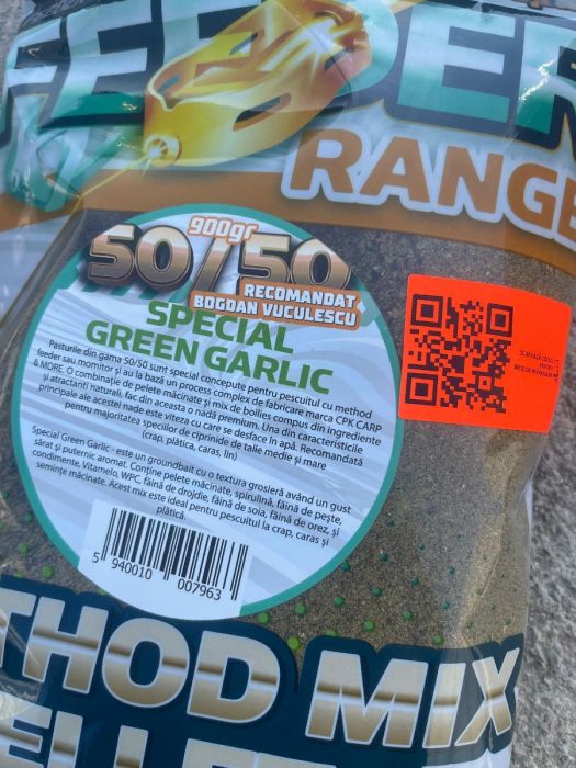 Захранка CPK 50/50 Groundbait Method Mix Special Green Garlic 900гр – Гамата 50/50 са специално проектирани за метод фидер или риболов с кошничка и са базирани на комплексен производствен процес на марката CPK CARP & MORE. Комбинация от смлени пелети и микс от бойли, съставени от съставки и естествени атрактанти, правят това първокласна захранка. Една от основните характеристики на тази захранка е скоростта, с която се разтваря във вода. Препоръчва се за повечето средни и големи видове риби като шарани, каракуди и дори големи платики. Special Green Garlic е солена захранка с аромат на чесън, подправки, едра, съдържа смлени пелети, спирулина, рибно брашно, подправки, WPC, брашно от мая, соево брашно, оризово брашно и смлени семена. Този микс е идеален за риболов на шаран. Аромат: Чесън.