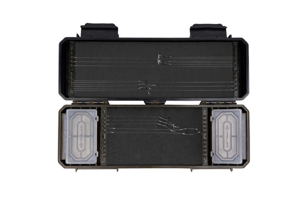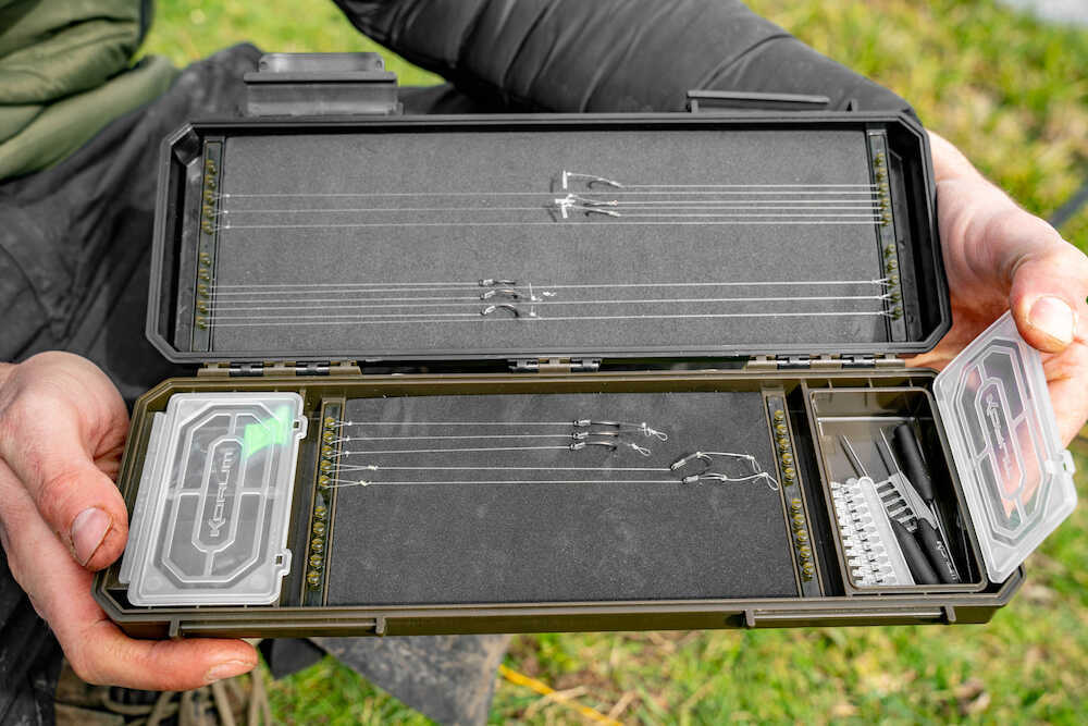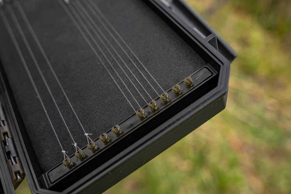 Класьор за шарански поводи Korum Speci Rig Blox – Speci Rig Blox има няколко уникални функции, които осигуряват стабилно съхранение на вашите вързани куки. Готовите куки се държат спретнато в позиция без нужда от щифтове. Сигурно затваряне на кутията. Размер: 116х295х40мм.