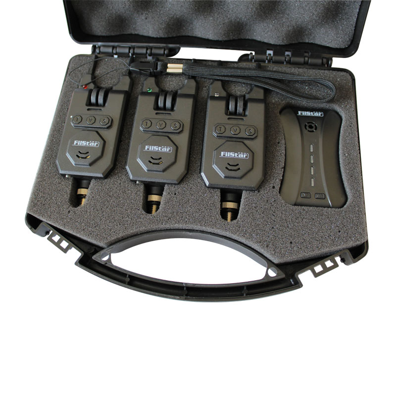 Комплект сигнализатори Filstar FSBA – 21 3+1 – Комплект от 3 аларми и централа. Обхватът на централата е 100 – 200 метра в зависимост от условията на заобикалящата среда. Звукът на централата може да бъде намален до 0. Работна честота – 433.92 MHz. Централата работи с 3 х AAA батерии, които не са включени в комплекта. Сигналът на алармите не се препокрива с този на други риболовци. Алармите са водоустойчиви с подвижни ограничители. Можете да настройвате силата на звука, тона и чувствителността. Притежават жак за индикатор. Настройките се запаметяват и след изключване.