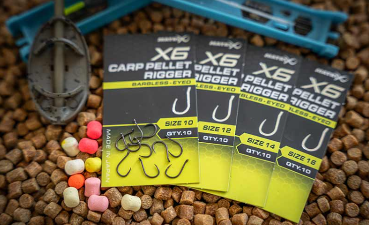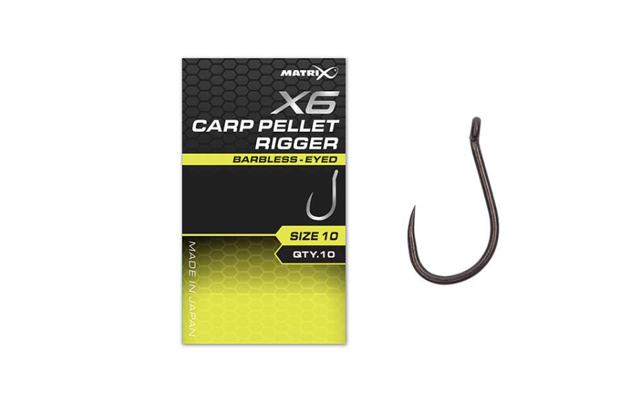 Куки с ухо без контра Matrix X6 Carp Pellet Rigger Barbless Eyed – Изключително здрава кука с PTFE покритие и обърнато ухо. Идеална форма за риболов с пелета, царевица, дъмбели или топчета. Подходяща за монтаж с bayonet „шип“ или bait band „силиконов ринг“. Предназначени за риболов на шаран.