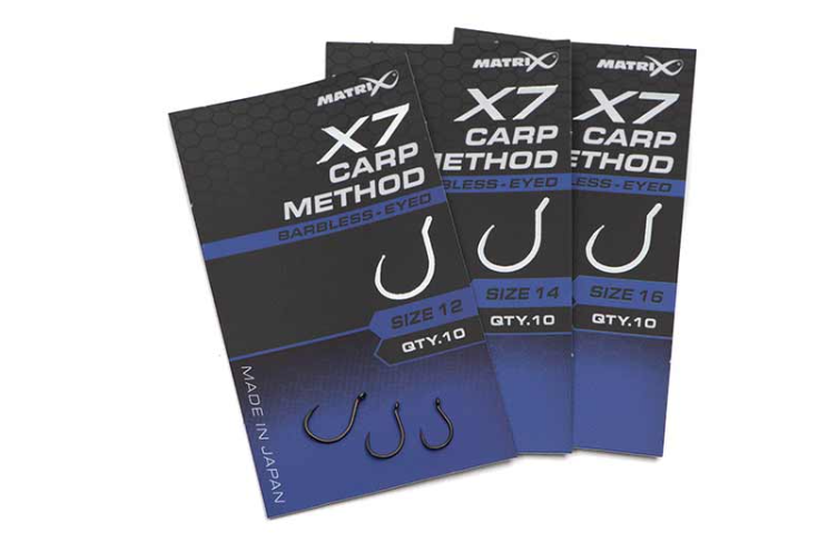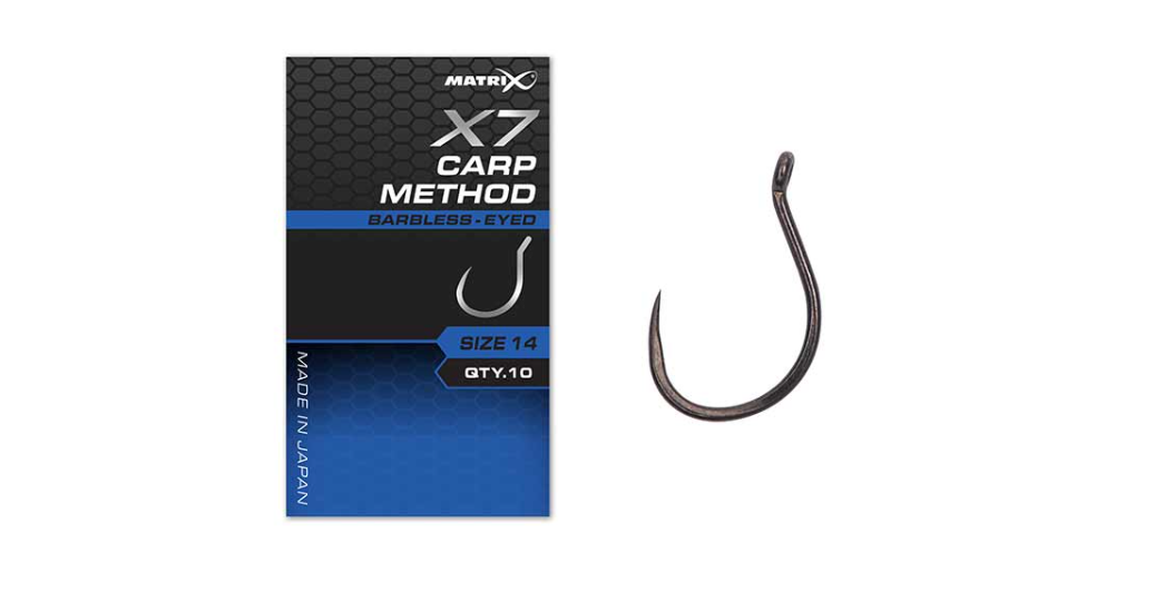 Куки с ухо без контра Matrix X7 Carp Method Hooks – Много здрави куки с PTFE покритие с кръгла и широка форма. Идеална за метод фидер риболов с дъмбели, царевица или бойлита за шаран. Проектирана форма за закачане на повече риба и по – малко откачени по време на вадене.