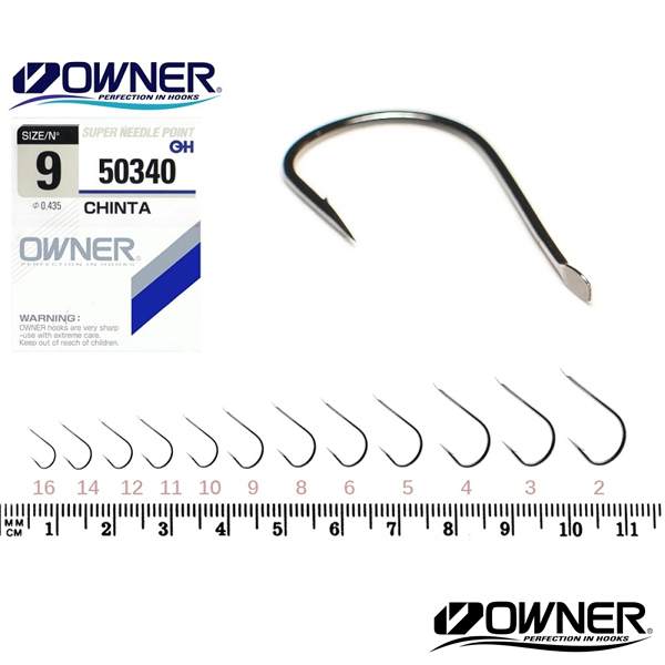Owner Chinta e универсална кука с широко приложение. Много тънка, остра и пробивна Chinta може да се справи с всякакви риби. Куката е кована и е подходяща за риболов с почти всички видове стръв като торен червей, бял червей, жълъдов червей, камола, троха, жито и др. Големите размери са подходящи за риболов с жива рибка или жабка за костур, речен кефал, бяла риба и др. Цветът на куката е черен никел.