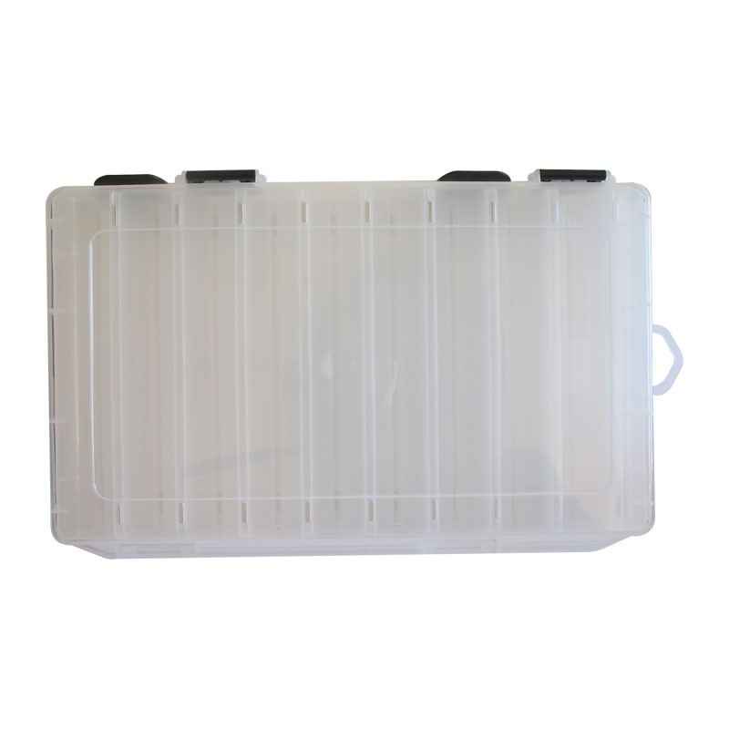 Удобна кутия за воблери с 18 отделения. Кутията е прозрачна и двустранна със сигурни закопчалки. Кутията побира воблери до 19см. Размери: 35.5х23х5см.