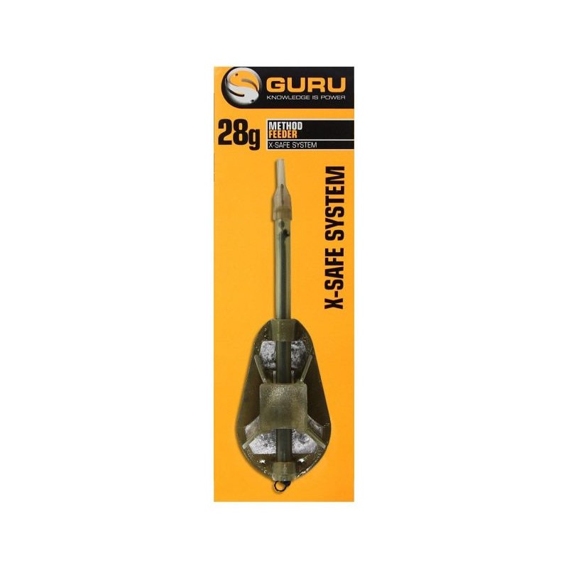 Метод фидер хранилка Guru X – Safe Method Feeder Large – Иновативен модел метод фидер хранилка на Guru, проектирана от риболовните експерти Alex Bones и Steve Ringer. Тя гарантира безупречна презентация на стръвта. Никакво оплитане или заклещване на стръвта в хранилката. В центъра на фидер хранилката е предвидено място за поставяне на куката със стръвта на специална “платформа”. По този начин куката със стръв се намира в горната част на X – Safe Method хранилката. Използвана е X -Safe системата от тръбичка и ластик, разработена за омекотяване на първоначалния удар на рибата, както и за по-сигурно и ефикасно довеждане на рибите до брега, също елиминира и вероятността от скъсване, поемайки натоварването.