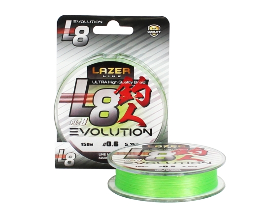 Lazer PE L8 Evolution Fluo Green е 8-нишково PE плетено риболовно влакно от най-висок клас. Произведено от най-добрите 100% UHMW-PE фибри. Изключително здраво и устойчиво, благодарение на супер стегнатата си – „hi-pitch” оплетка. С идеално кръгло сечение и гладка повърхност, позволяващи по-далечни и прецизни замятания, както и по-малко триене и шум от водачите при навиване. Предлага изключителна чувствителност и трайност. Запазва цвета си дълго време. Подходящо за всякакъв вид риболов – сладководен и морски от лодка, тролинг, спининг, фидер и много други.