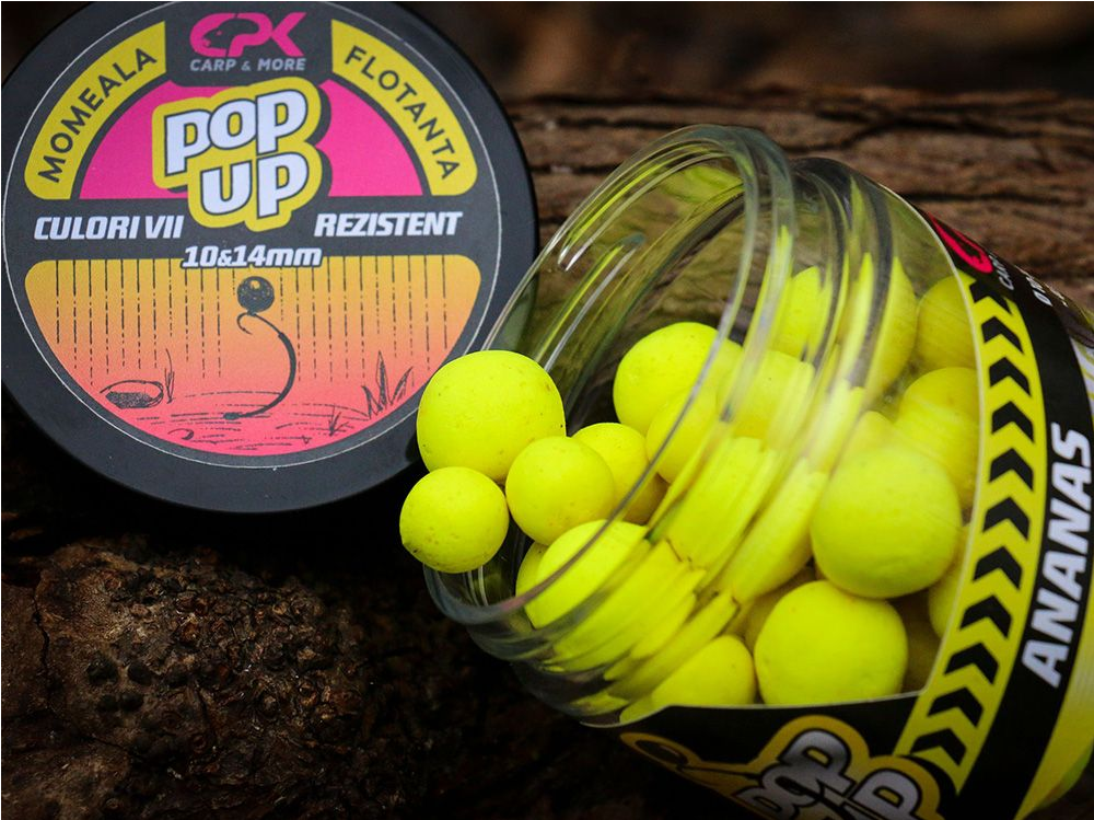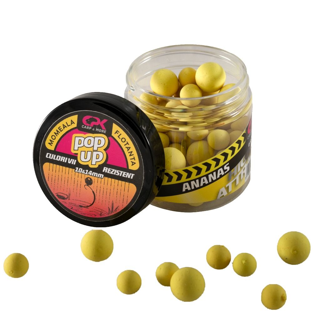 Поп ъп топчета CPK High Attract Pineapple 10 & 14mmCPK Pop-ups, са несъмнено едни от най-плаваемите продукти на риболовният пазар. В тези бурканчета ще намерите смесени поп ъп топчета с размери 10 и 14мм. Те се доказват всеки път. CPK Pop-up, може прфектно да презентирате Stiff-Hinge Rig, за повече от 24 часа на дъното на всеки един водоем. Базовият микс е добре хомогенизиран и е с лека и въздушна текстура, което позволява постепеното освобождаване на атрактанти, хранителни стимулатури и аромати ! Ние знаем, че визуалното привличане е ключова част при риболова на шаран и за това CPK Pop-ups са налични в широка гама от флуорисцентни и ярки цветове, направени така, че да излъжат и най-внимателните и хитри шарани, също така да задоволят изискванията на най-взискателните шаранджии! Подходящи за метод фидер риболов. Аромат: Ананас, флуоресцентен жълт цвят.