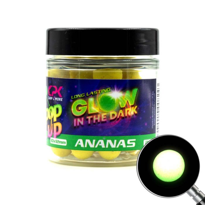 Поп ъп топчета CPK Pop Up Glow In The Dark Pineapple 10 & 12mm – Нови поп ъп топчета от румънския бранд CPK. Топчетата се предлагат микс с размери 10 и 12мм в бурканче. Жълти на цвят. Иновативното и ново при тях е че те са светещи / Glow In Th Dark /. Тези иновативни топчета, ще бъдат забелязани и от най – апатичния шаран. Аромат: Ананас. Подходящи за всякакъв тип шаранджийски и метод фидер монтаж.