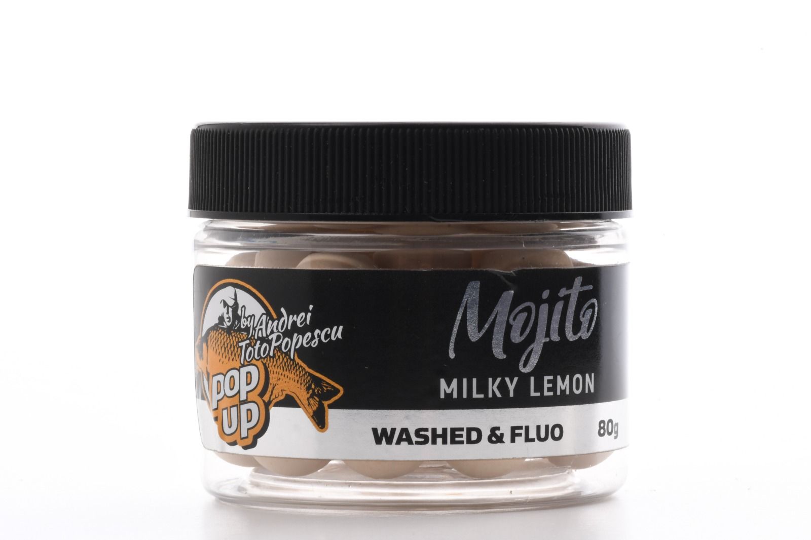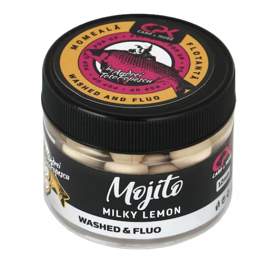 Поп ъп топчета CPK Pop Up Golden Range Mojito /Milky Lemon/ 12mm – Golden Range е нова гама плуващи Pop up топчета от портфолиото на CPK, създадена съвместно с Андрей „Тото“ Попеску. Гамата съдържа 12 мм Pop up топчета в 6 вкусови комбинации, във всеки буркан има 2 вида цвят: измит и флуо. Вариантът fluo е подходящ за мътни води или ситуации, при които рибата се храни много добре, когато стръвта, която се откроява, ще донесе допълнителни функции. Pop up топчета в измитата версия, в “измити” цветове, са идеални при риболов в много чиста вода или рибата се храни апатично и може да не е склонна да се доближи до шумна стръв. Тези примамки за куки са изградени върху сложна смес, която съчетава висока плаваемост с изключително ниво на привлекателност, благодарение на комбинираните аромати. Те са специално проектирани да се използват в единични монтажи (Ronnie Rig, Chod, Witty Pool и 360) или в монтажи на Snowman в комбинация с твърди бойли от серията CPK. Диаметър: 12мм, Аромат: Млечен лимон.