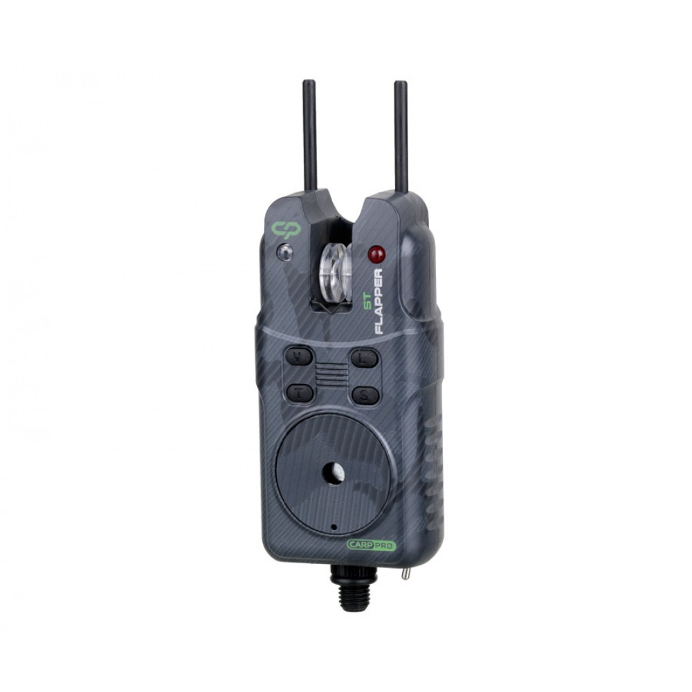 Carp Pro Flapper ST Bite Alarm са надеждни, удобни и съвременни сигнализатори. За по – голямо удобство, сигнализаторите са поставени в куфарче в което има неопренови легълца, които ги предпазват от повреждане и удряне. Carp Pro са се постарали и с външния вид, като сигнализаторите са със стилна камуфлажна окраска. Комплектът включва 3бр. сигнализатори, една майка, връзка за шията за по – удобно носене на майката и сменяеми странични щипки, когато ловите във ветровито време. Всеки сигнализатор има 8 режима на звук, 8 режима на силата на звука и 6 режима на чувствителност. На предния панел има 4 бутона, с които можете да регулирате звука, тона, чувствителността, да превключвате в режим „нощ“ и т.н. Всяко сигнално устройство има функция за памет, което дава възможност да се запомнят всички текущи настройки и да не се настройва сигнализаторът от нулата на следващия риболов. Има нощен режим, когато е включен, сигнализиращата ролка на сигнализатора свети. Carp Pro Flapper ST Bite Alarm имат висока защита от влага. Обхват на сигнализаторите до 200м.