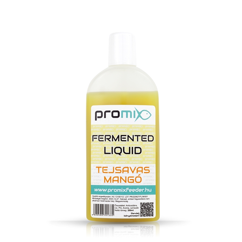 Течен ароматизатор Promix Fermented Liquid N – Butyric & Mango – Ферментиралите течности Promix достигат крайната си форма след истинска, пълна млечнокисела ферментация от 42 дни. В течностите има зърна, това са смлените семена, които образуват течността при ферментацията. В много случаи те са наслоени в бутилката, така че трябва да се разклати преди употреба. Изключително ефективни при риболов на шаран и бял амур. Може да се използва за смесване и ароматизиране на всякакъв прахообразен фуражен материал, варени семена и дори пелети. Аромат на маслена киселина и ферментирало манго.