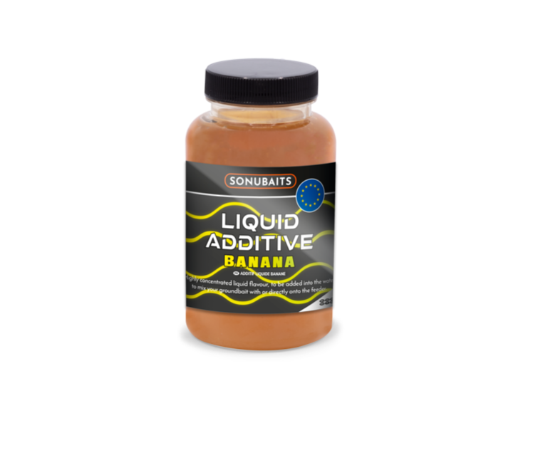 Течен атрактант Sonubaits Liquid Additive Banana – Силно концентриран течен аромат, който може да се добави към водата при смесване на захранка, за да се подобри привличането на риба. Може да се добавя във водата и при накисване на пелети или към царевица. Аромат: Банан.