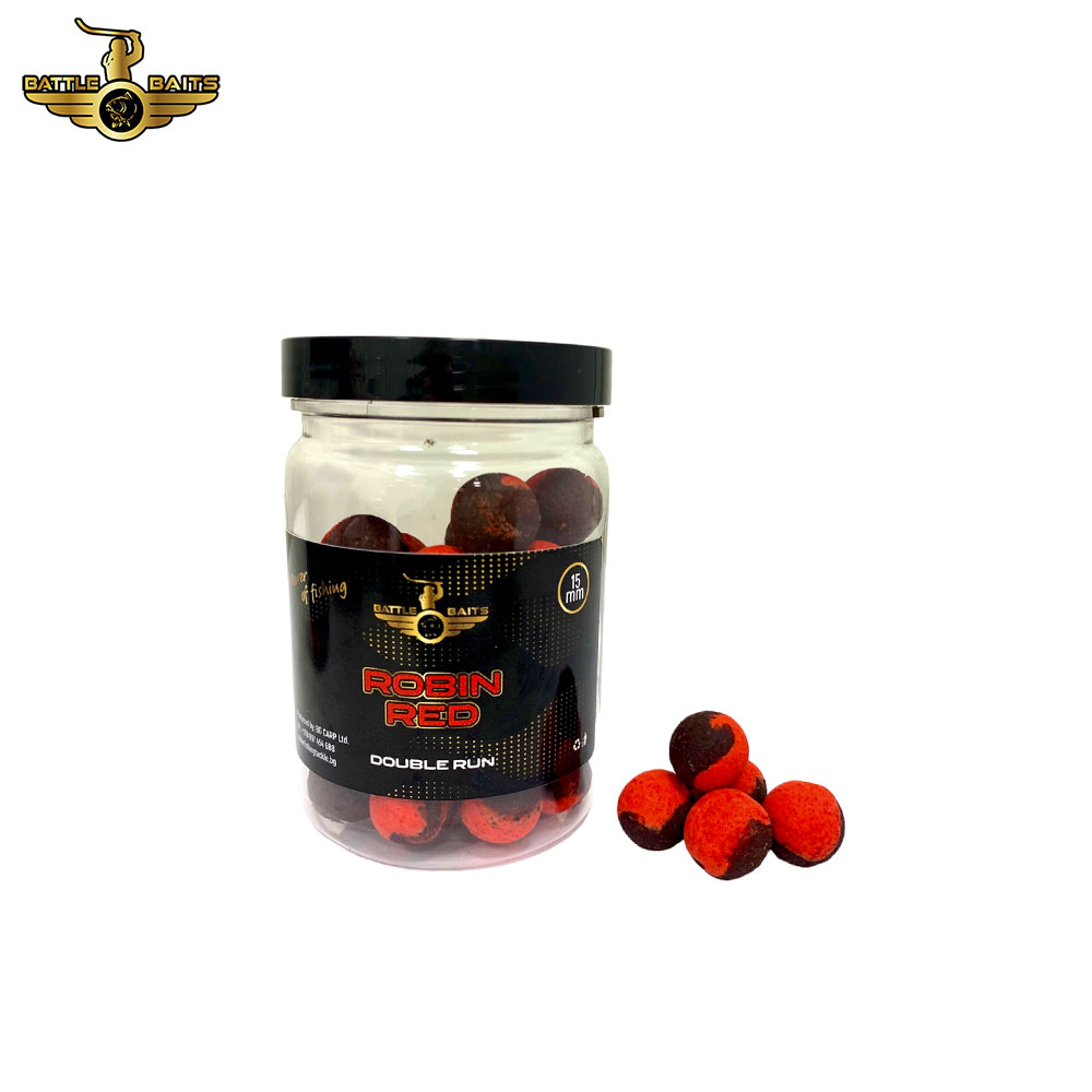 Топчета Battle Baits Double Run Robin Red 15мм – Бойлите от серията Double Run или още наречени 50/50 са превъзходната сила на критично балансираните топчета. Направени от 50% микс от фишмийл бойли и 50% Pop Up, те съчетават както хранителните свойства на протеиновите топчета, така и бързата привлекателност, придадена от силния цвят и аромат на поп – ъпите.