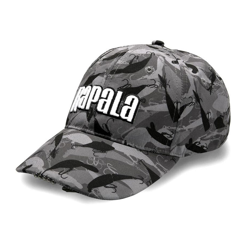 Шапка Rapala Pro Wear Lighted LED Cap – Модерна шапка с козирка с камуфлажен сиво-черен дизайн на воблери. Шапката разполага с 5 вградени LED лампички на козирката.