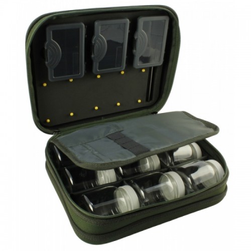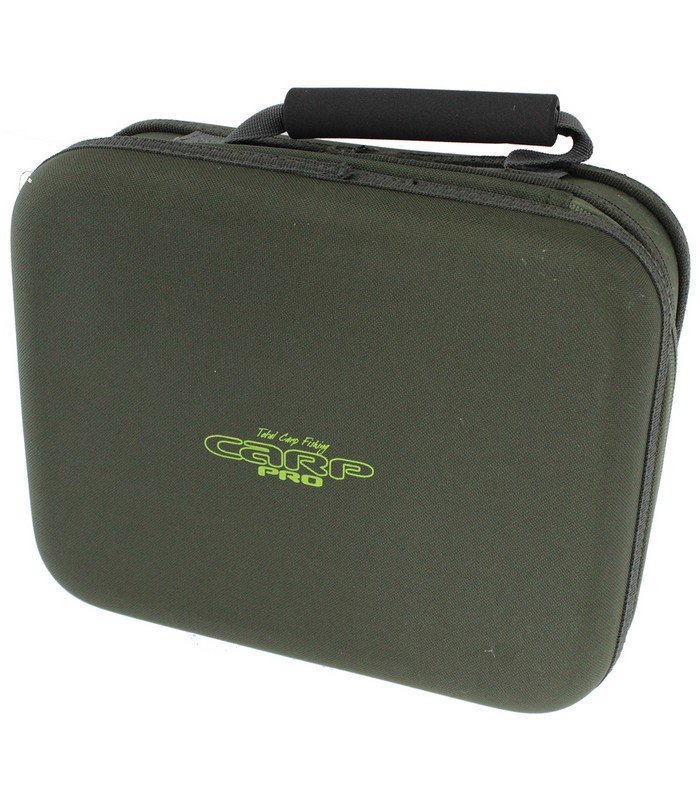 Шаранджийска чанта с аксесоари Carp Pro – Изключително компактна чанта подходяща за всеки шаранджия. Чантата включва 3бр. кутии с прозрачен капак предназначени за дребни аксесоари и такъми, твърда пяна предвидена за съхранение на поводи, 9бр. малки бурканчета изработени от прозрачна пластмаса с капаци с винт, които могат да бъдат изпозлвани за топчета, царевица, пелети или друга стръв. Чантата разполага също така и с комфортна дръжка за носене. Размери на чантата:30x25x11.5см.