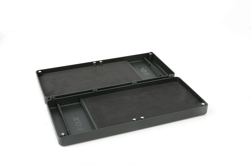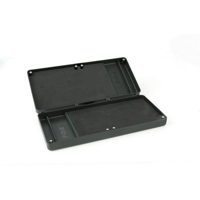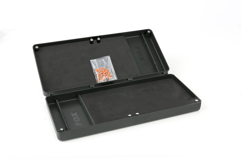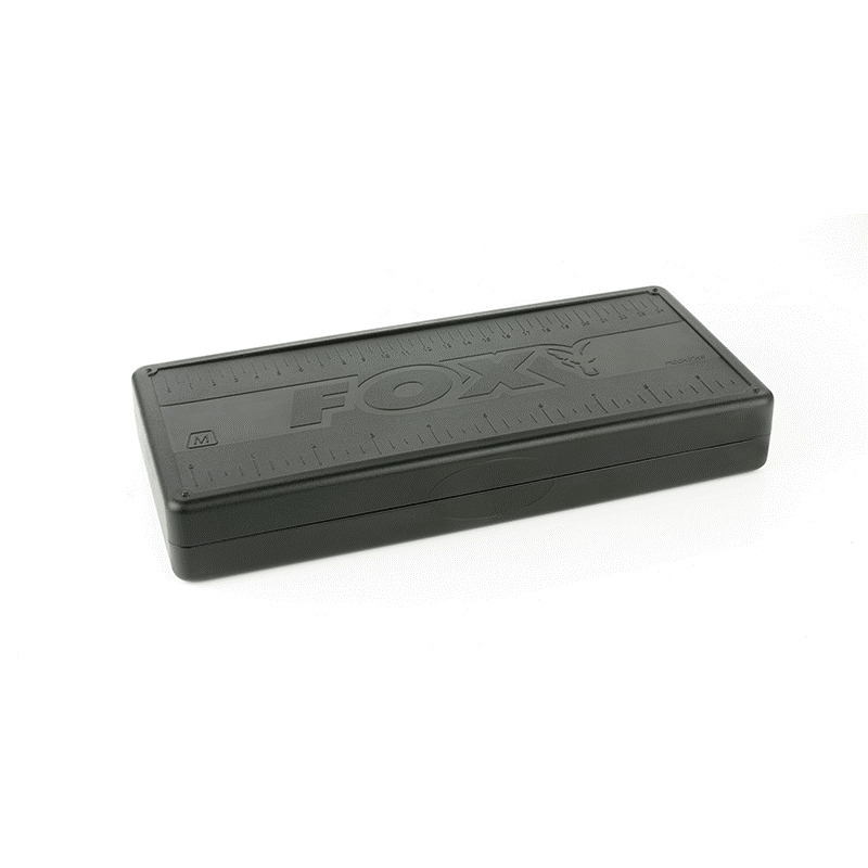 Кутия – класьор за поводи Fox Double Rig Box System Medium – Състои се от 2 средни повододържача. EVA пяна с висока плътност осигурява стабилно закрепване на пиновете. Профилираният държач за куки не позволява на поводите да се плъзгат и оплитат. Магнитни панти позволяват да се разделят двата държача за поводи. Съвместимост с F-Box Magnetic Medium Rig Box Lids. Плътно затваряне благодарение на магнитите. Отпечатана на капака мерителна линия позволява точно измерване при изработване на монтажите. В комплекта има 50 пинчета за закрепване на готовите поводи. Размери – 27 х 12 х 4см.