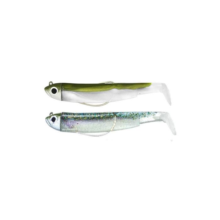 Fiiish Black Minnow Double Combo №1 – 7 cм, 3гр– включва два готови монтажа, в цветове показани на снимката. Състои се от 2 бр. глави 3гр., 2 бр. куки и 2 тела. Размерът е 7 см. За да се възползвате от други цветове, можете да направите комбинация от отделно предлаганите куки, глави и тела. Важно е да комбинирате един и същ номер. Тези силикони са подходящи както за соленоводен, така и за сладководен риболов.